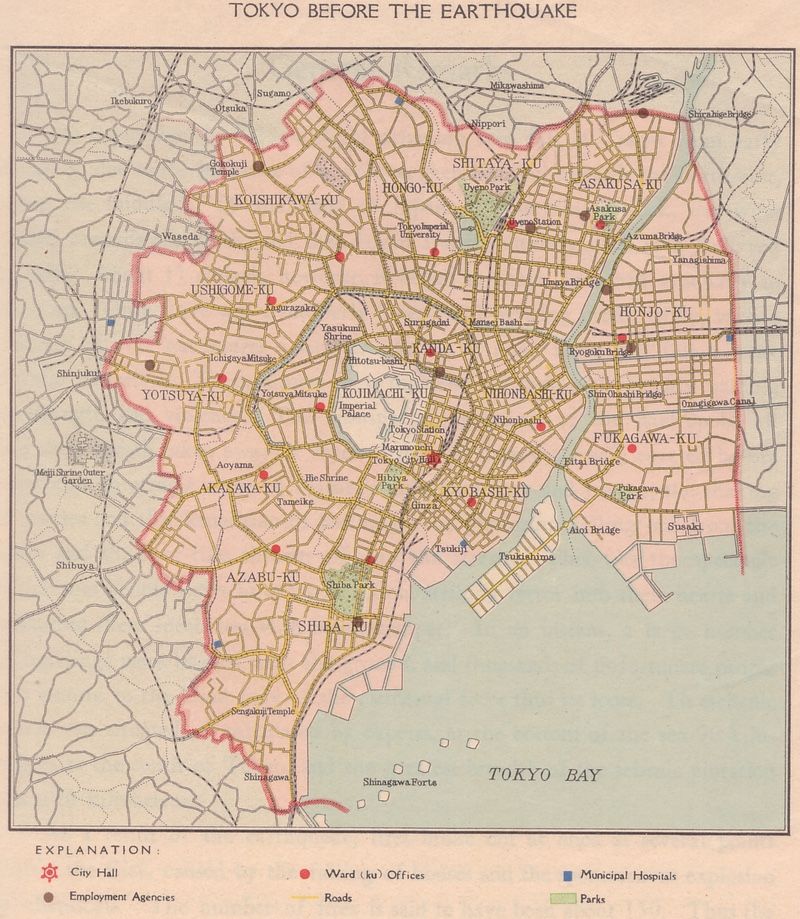 تعود هذه الخريطة إلى المدينة ما قبل عام ١٩٢٣ وهي موجودة في كتاب ”إعادة إعمار طوكيو The Reconstruction of Tokyo“ المنشور من قبل مكتب بلدية طوكيو عام ١٩٣٣ بعد مرور عقد على زلزال كانتو العظيم في عام ١٩٢٣ والذي أتى على جزء كبير من المدينة. وبالإضافة إلى أحياء طوكيو الـ١٥، تم ضم ٢٠ حياً إضافيا في عام ١٩٣٢، وفي عام ١٩٤٣ تم إلغاء المدينة وتحولت إلى مركز العاصمة طوكيو بمساحة أكبر. كما قادت الإصلاحات التي جرت في عام ١٩٤٧ في فترة ما بعد الحرب العالمية الثانية إلى تنظيم أحياء العاصمة كما هي موجودة في الوقت الحالي (الصورة من موقع ويكيبييدا).