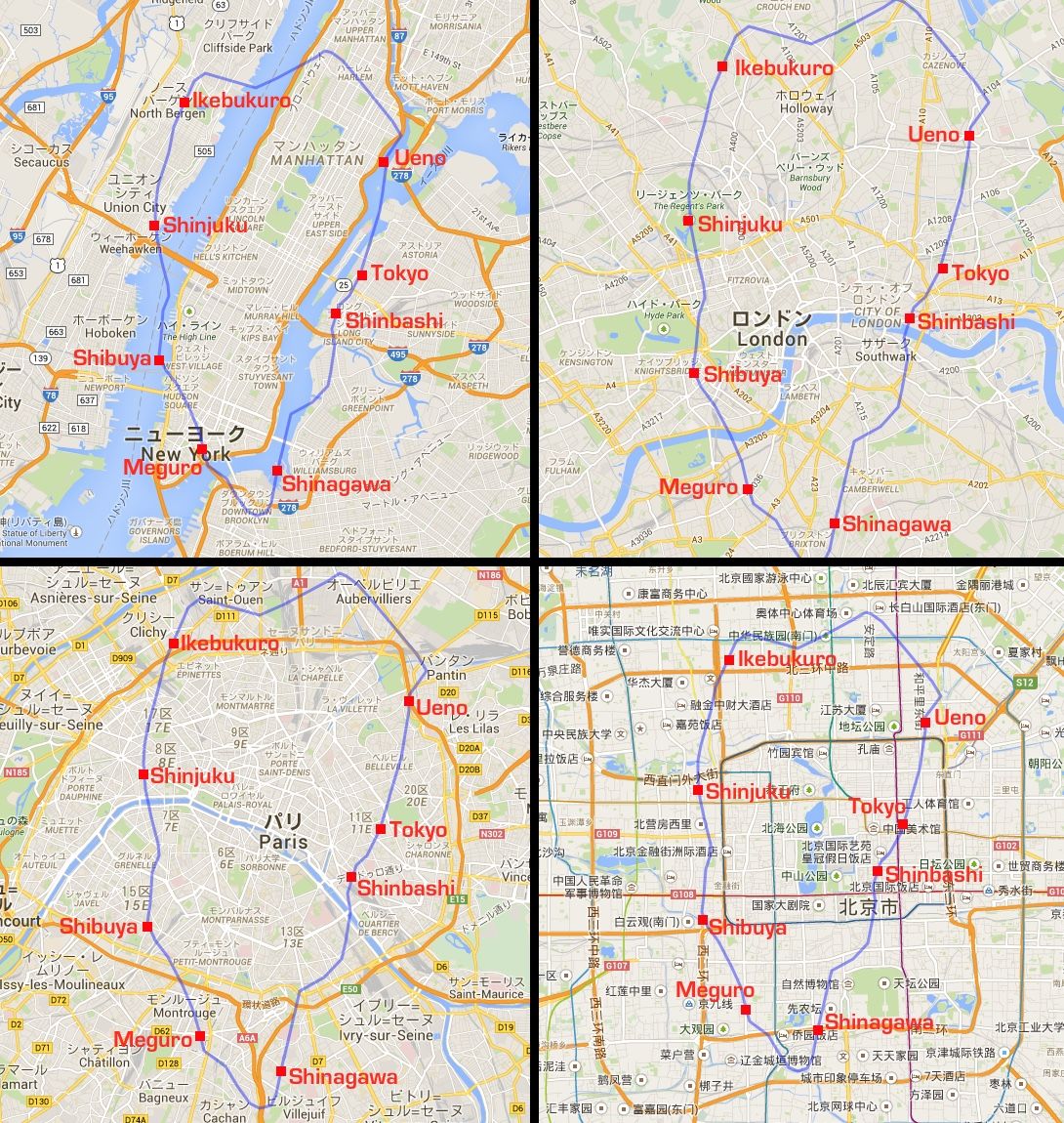 هذه الصورة ليست خريطة لطوكيو، ولكنها تظهر خط قطار يامانوتيه Yamanote Lineالتابع لشركة JR والذي يسير بشكل دائري في مركز العاصمة. وخط القطار هذا تم إسقاطه بنفس المقياس على خرائط مدن عالمية أخرى هي: نيويورك، لندن، باريس، بكين. (الخرائط مأخوذة من موقع MAPfrappe).