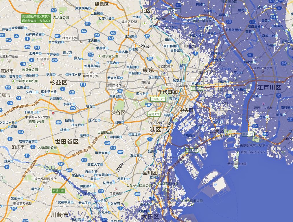 يتوقع علماء المناخ أن يتسبب ذوبان الغطاء الجليدي في جرينلاند بحدوث ارتفاع بمعدل ٧ أمتار في مستويات مياه البحار على المستوى العالمي. وإذا حدث ذلك فإن طوكيو سوف تبدو مع ٧ أمتار إضافية من المياه كما هو موضح في الخريطة، حيث سيصبح معظم منطقة شيتاماتشي ”المدينة المنخفضة“ في الشرق جزءاً من خليج طوكيو الأكبر منها بكثير. وستغمر الأمواج سوق الأسماك في تسوكيجي ومطار هانيدا وطوكيو ديزني لاند في محافظة تشيبا. (الخريطة من موقع Firetree.net).