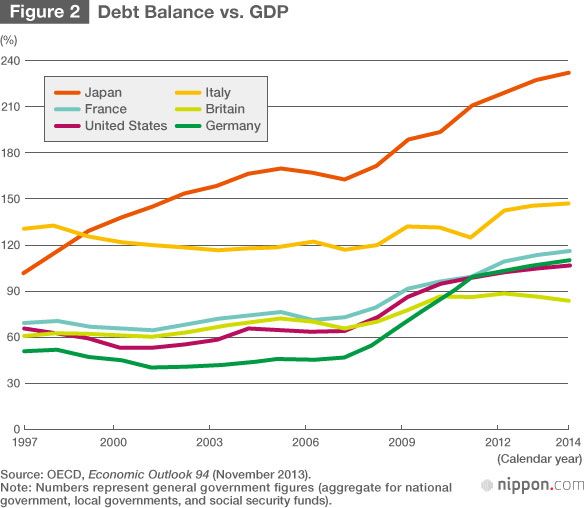 Japan stands head and shoulders above everyone else in international comparison of government debt versus GDP, according to the Organization for Economic Cooperation and Development. In 2014, Japan’s balance of government debt was 231.9% of GDP, more than double the level for France, Britain, or the United States. Japan finds itself at a more precarious level than Greece, a country that has sparked an economic crisis in Europe due to its worsening fiscal conditions.