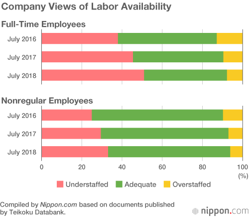 The results of a corporate trends survey on employee shortages conducted by the private research organization Teikoku Databank were released in July 2018. For the first time, more than half of the surveyed companies, 50.9%, responded that they do not have enough full-time employees. This rate, having already risen from 37.9% in July 2016 to 45.4% in July 2017, further indicates the increasing shortage of workers in the corporate sector.