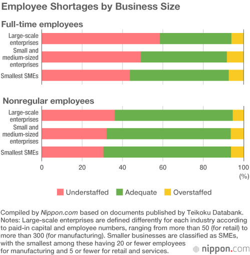 Teikoku Databank also categorized responses according to the size of the business, as defined in the Small and Medium-sized Enterprise Basic Act. The results showed that 58.5% of large-scale enterprises and 49% of smaller businesses evaluated they were understaffed. Within the category of small and medium-sized businesses, 43.6% of the smallest firms responded that they had shortages. There is a visible trend showing that the larger the business, the more seriously the employee shortage is felt.