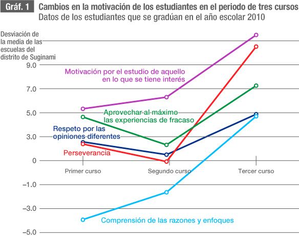 Como resultado de estos esfuerzos, ha habido un claro aumento en tres años en áreas como “comprensión de las razones y enfoques”, “motivación por el estudio de aquello en lo que se tiene interés”, “respeto a opiniones diferentes”. (Fig. 1)