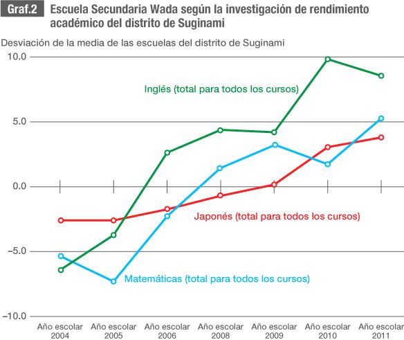 Gracias a estas innovaciones, en los últimos siete años la Escuela Secundaria Wada ha pasado de estar en una posición cercana a la parte inferior de las veintitrés escuelas secundarias del distrito Suginami de Tokio, a convertirse en una de las mejor posicionadas en términos de resultados académicos hoy en día, lo que nos sitúa entre las escuelas de mayor éxito en Tokio. (Fig. 2)