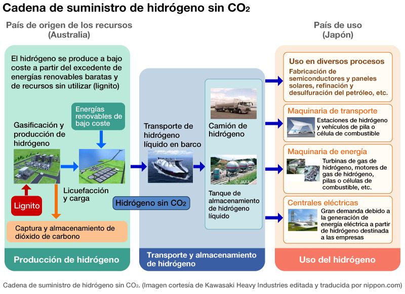 Este proyecto consiste en producir hidrógeno a partir de lignito gasificado en el estado australiano de Victoria, capturar y almacenar el dióxido de carbono en la zona y transportar el hidrógeno en barcos especiales hasta Japón, donde se emplea para generar electricidad y alimentar a vehículos, entre otros fines.