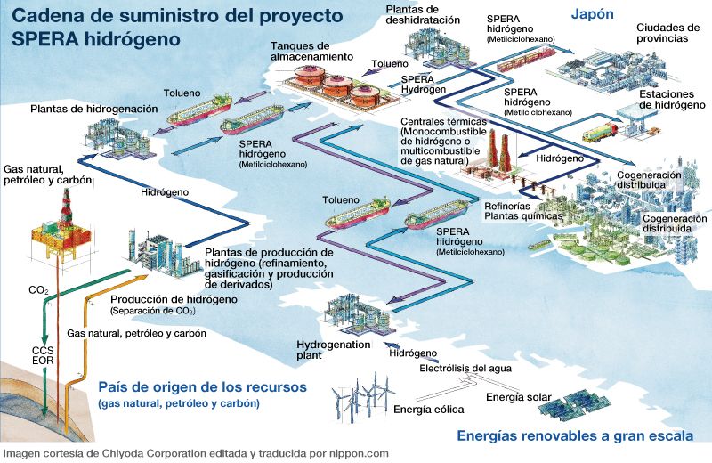 El hidrógeno se puede combinar también con el petróleo, el gas natural, la energía eólica y la energía solar. El proyecto SPERA hidrógeno, del que la firma Chiyoda Corporation se propone hacer negocio, es un claro ejemplo de ello.