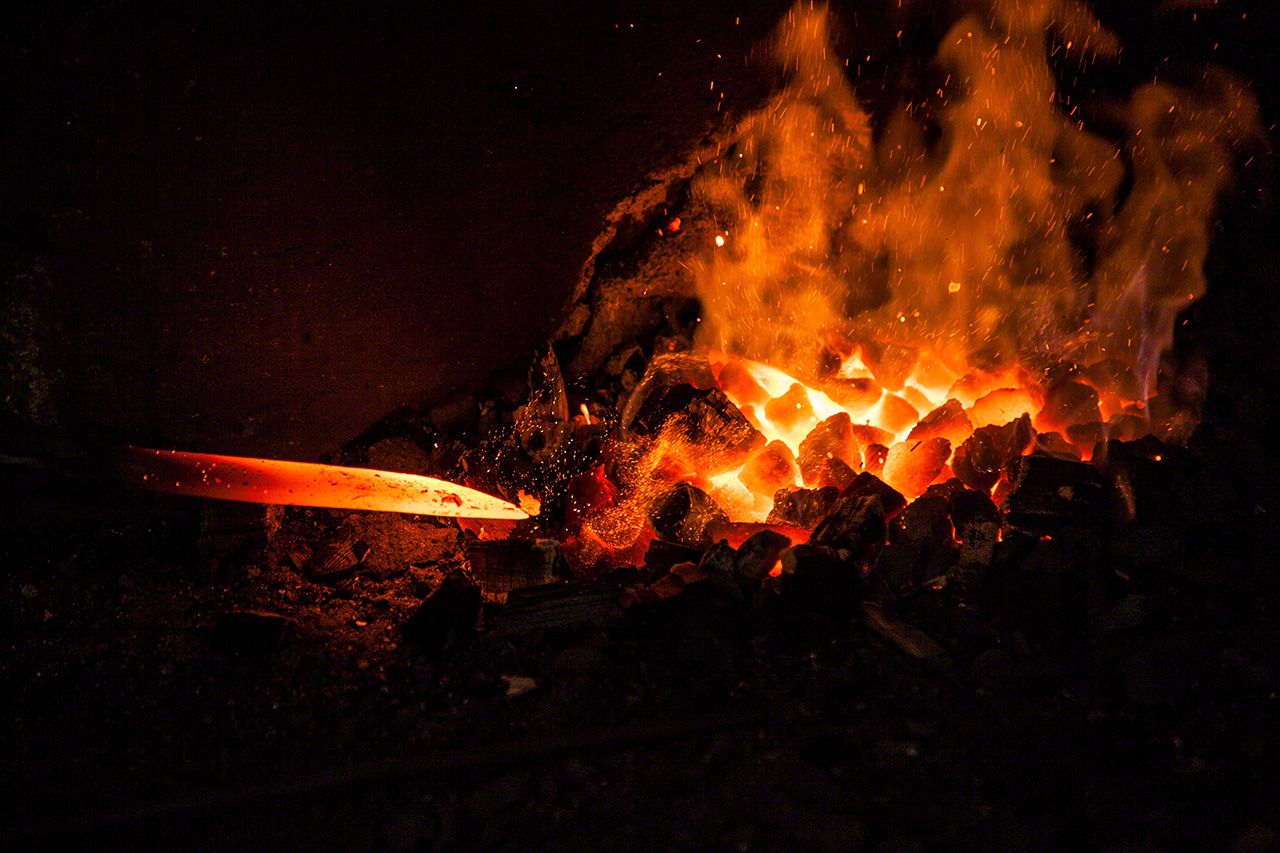 Una azada entre carbón al rojo vivo en el taller de Hosaka Heizō en Odawara, prefectura de Kanagawa.