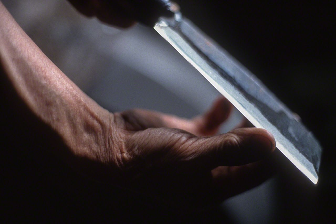 Comprobando el filo con los dedos durante el afilado. Taller de la herrería Taue de Totsukawa, prefectura de Nara.