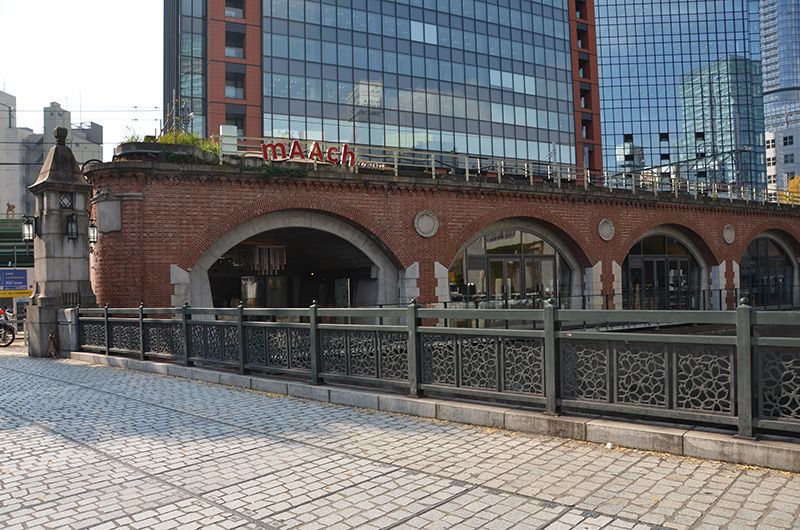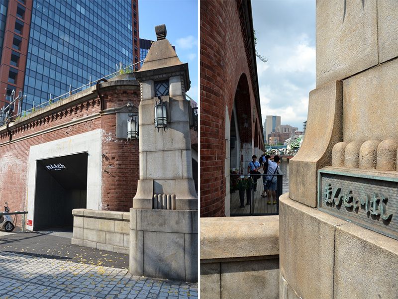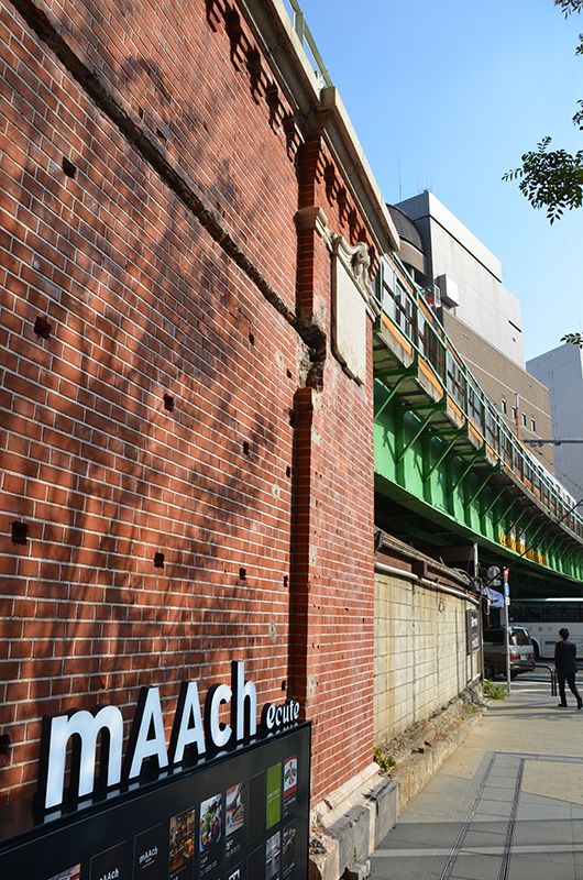 聳立在神田川上、萬世橋旁的舊萬世橋車站在1912年(明治45年)通車,是中央本線的終點站,也曾經是與上野、新橋車並列的東京代表車站之一。那醒目的兩層樓紅瓦建築是出自於設計東京車站的建築師辰野金吾之手。據說臺灣的總統府與臺灣大學附設醫院、紅樓戲院等也都是呈現辰野式風格的古蹟,難怪讓我非常眼熟。這個比東京車站更早誕生的建築,自1943年廢站後因年代久遠逐漸老舊,在2012年7月由JR 東日本宣布重新開發整修,於2013年的九月變身成一個摩登又復古的商業設施「mAAch ecute KANDA MANSEIBASHI(神田萬世橋)」重新登場。