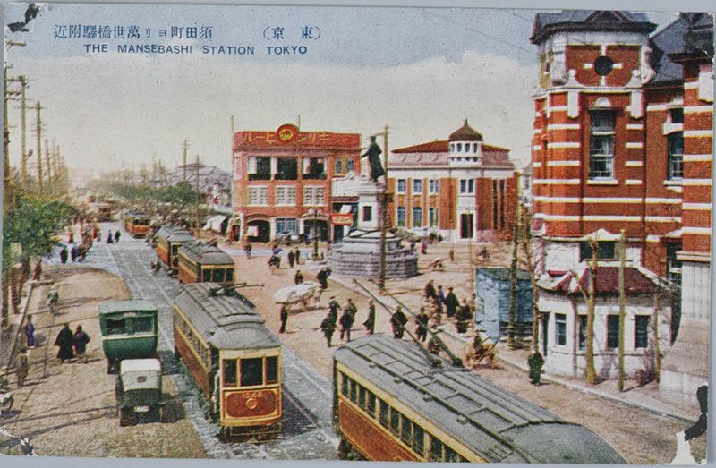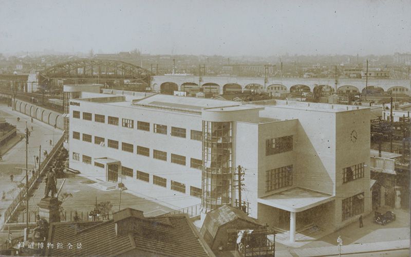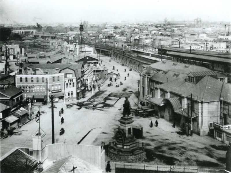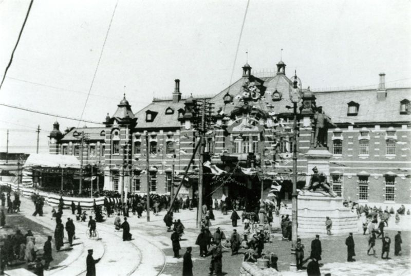 1912年開野當初的車站(《日本相冊》,國立國會圖書館收藏)。這座與東京站丸之內車站大樓相仿的火車站,在1923年的關東大地震中毀於大火,此後於1925年重建,並於1936年再建,同時設置了鐵道博物館(交通博物館的前身)