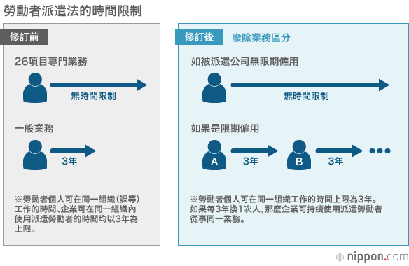 此後,經過政府、勞方和資方等三方組成的審議會的討論後提交到國會的此次法律修訂方案針對被派遣公司無限期僱用的派遣勞動者廢除了時間限制。同時,針對限期僱用的派遣勞動者,勞動者個人可以在派遣服務對象的同一組織單位(課等組織單位)工作的時間上限為3年,派遣服務對象可以接收派遣勞動者的時間上限原則上為3年,聽取過半數工會的意見後,規定只要換人,就可以延長派遣時間。