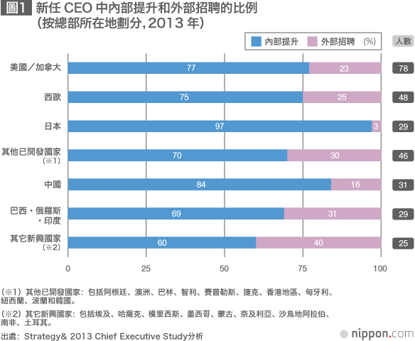 這種外聘高階人才的做法在歐美企業早已司空見慣,但在日本還比較少見。據美國經營諮詢公司「Strategy&」(日本法人名:PwC Strategy&)實施的2013年度調查(針對全球2,500家大型上市企業)顯示,日本企業中通過內部提升的新任CEO占絕對多數,比例高達97%,而從公司外部招聘的CEO僅占3%。在美國和加拿大,企業外聘CEO比例為23%,西歐各國為25%,埃及、土耳其、南非和墨西哥等其它新興國家則達到了40%。(圖1、2)