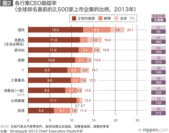 這份調查的結果還反映出了日本企業社長人事情況的特點。日本新任CEO的平均年齡最大為61歲,遠高於世界平均水準的53歲。同時,擁有國外工作經驗的新任CEO比例為37%,相較於2012年的17%有了大幅成長(世界平均水準為35%)。另一方面,2009-2013年期間,日本企業聘用外國人擔任CEO的比例僅為2%(世界平均水準為18%)。