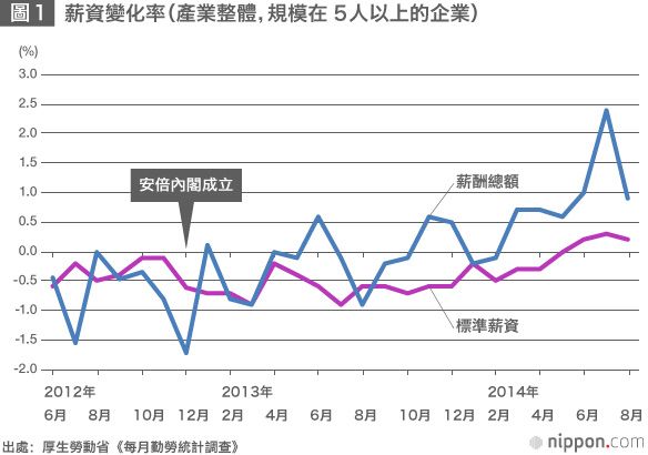 進入2014年,隨著薪酬總額的上漲加速,標準工資也終於開始上升。這是勞資雙方本著政府、勞、資三方會議就實現經濟良性循環所達成的共識,在「春鬥」(*4)中經過多輪談判取得的成果,使加薪趨勢逐漸擴大。但是,薪資仍然跟不上物價上漲水準的傾向依然明顯,在安倍經濟學背景下,實際薪資的下降還在繼續。