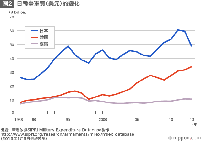 軍事方面的情況也是如此。比如,圖2以美元為單位展示了日韓臺三國的軍費變化,我們可以發現,原本占到GDP的近3%這樣一種相對較大比例的韓國軍費,受到近年來韓元升值的影響,正迅速接近日本的水準。姑且不考慮軍事力量性質的差異,顯然兩國之間的軍事差距也在逐漸消失。