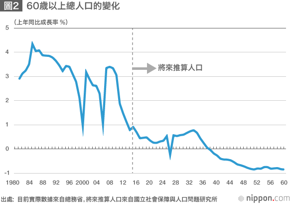 雖然截至目前,老年人消費看上去還呈現成長態勢,但今後還能繼續保持這種成長態勢嗎?我們可以通過對60歲以上人口的展望來思考這個問題。根據國立社會保障與人口問題研究所推算的未來人口(中間值),2017~2025年人口年均成長率估計僅為0.4%(圖2)。截至目前,支撐著老年人口增加的是「團塊世代」(1947~1949年出生的人口)。比他們年輕5歲左右的那一代,人數就沒有那麼多了,因此老年人口的增加趨勢也將變緩。