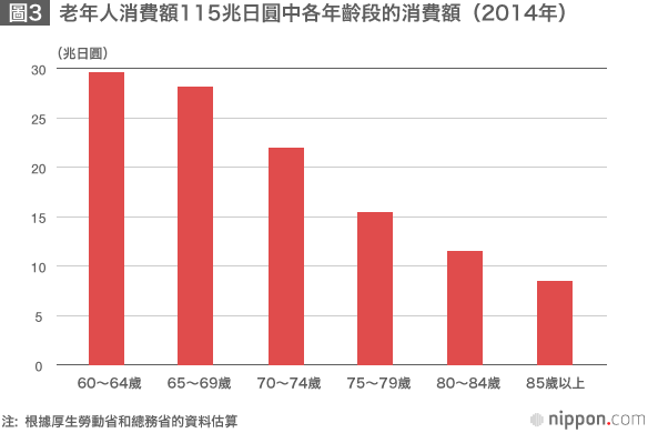 上面已經看過的2014年老年人消費額,如果按照年齡段分別計算的話,那麼從60歲到70歲以上,各年齡段的消費額是逐步遞減的(圖3)。這是因為,隨著家庭老齡化程度越深,家庭的戶均消費額就會逐漸減少。