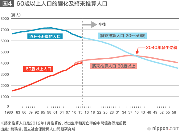 今後,老年人口將不再成長,勞動人口也呈加速度下降之勢(圖4)。既然這樣,有人主張引進移民就好了。但僅從2015~2020年來看,每年人口就將減少40~60萬人。為了填補這個缺口,每年引進相應數量的移民,這在技術上是不可行的。在這樣的背景下,希望那些對將來抱有不安之感的老年人群,為了未來的日本經濟耗盡一生積蓄去擴大消費,那也太殘酷了。