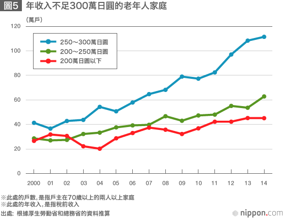 從時間的變化來看,年收入不足200萬日圓的70多歲家庭的戶數,現在為45萬戶,是5年前(32萬戶)的1.4倍,是10年前(20萬戶)的2.2倍,呈現出猛增趨勢(圖5)。以前,在就業形勢不好的時期,年輕人因失業而低收入化的情況很突出。近些年來,年輕低收入人群在減少。相反地,那些無法工作的70多歲老人,只能依靠養老金生活,收入越來越低。成為一時話題的「晚年破產」,就是指這些難以通過個人努力自救的老年人,單靠養老金已無法過活,陷入生活困苦之中的事例吧。