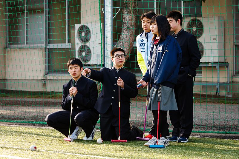 現在槌球隊共有男女9名隊員,都是高2和高3的學生。採訪當天,新入學的8名高1學生也參加了訓練體驗活動。他們都是以考入國立、公立大學和頂尖私立大學為目標的重點班學生,平時每天上課8小時,一直到下午6點結束,所以將訓練安排在了只上六4小時文化課的每週1。遇到下雨下雪不能使用操場時,就在校舍走廊鋪上人工草坪練習擊球。