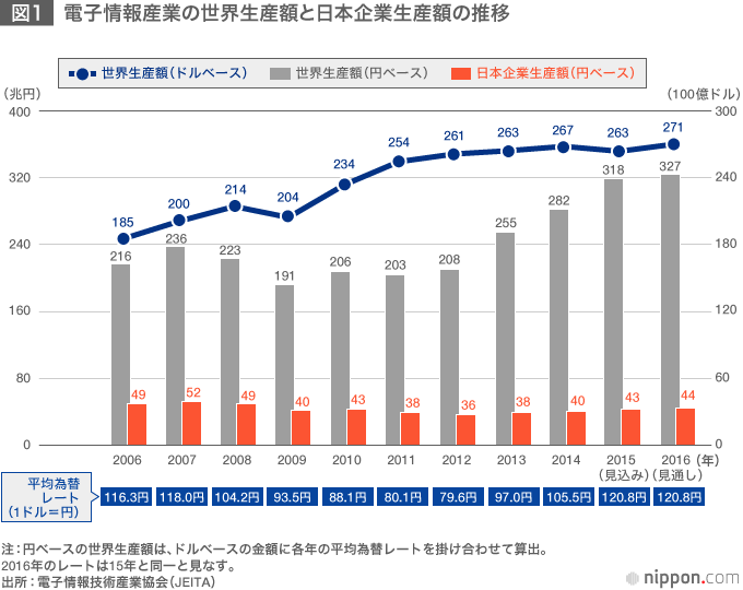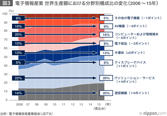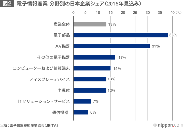 JEITAの調査によると、日本企業は15年時点で、電子部品で38%、AV(オーディオビジュアル)機器で31%、コンピューター・情報端末では15%という高い世界シェアを持っている。だが、上記の各分野が電子情報産業の世界生産額全体に占める比率は06年と比較して、AV機器は4ポイント減の6%、コンピューター・情報端末は4ポイント減の16%、電子部品は2ポイント減の8%と、いずれも下がっている。