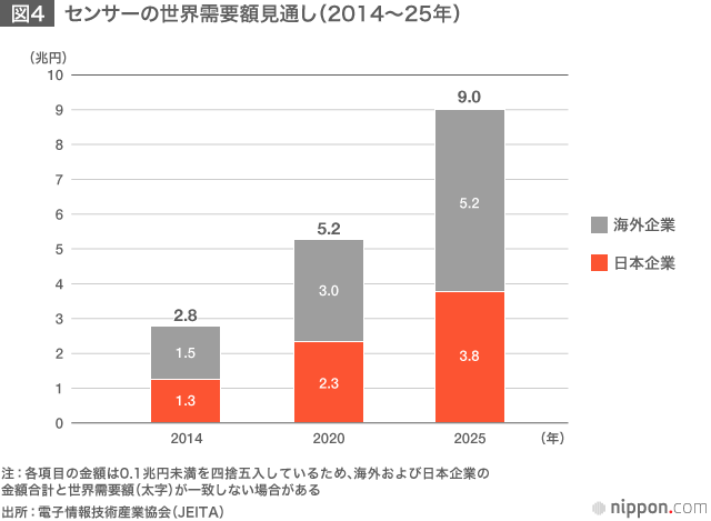 JEITAによると、全世界のセンサー市場は2014年に532億個の市場規模であったものが、25年までの年平均成長率は10%で、14年の2.9倍となる1522億個に拡大するという。また、金額ベースでは25年までに年平均11%増で成長し、3.2倍の9兆円に達するという。