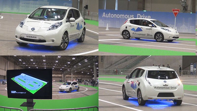 車両は電気自動車(EV)の「日産リーフ」をベースに製作。5台のレーザースキャナーと5台のカメラを組み込み、360度方向の道路状況をリアルタイムで認識し、ハンドルやブレーキを制御しながら自動運転を行った。