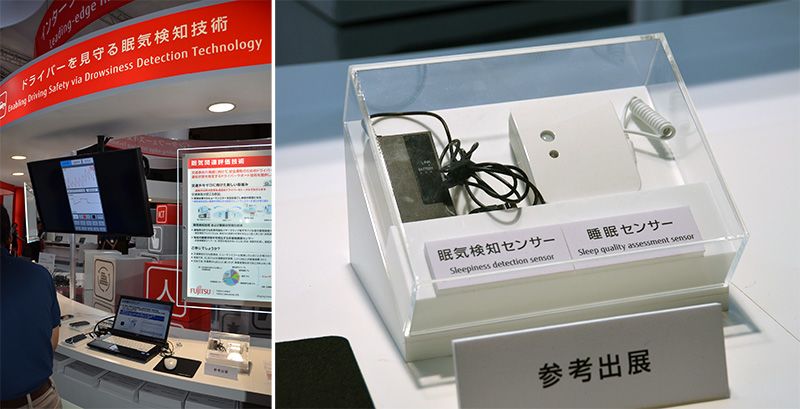 電機・電子部品メーカーからの出展にも安全運転支援技術が目立った。その1つが富士通の「ドライバーを見守る眠気検知技術」だ。心拍数の変化を読み取って事前に眠気を検知し、走行中の長距離トラックやバスのドライバーに注意喚起できる。既存の運行管理システムと組み合わせることで、運転手の眠気の進行リポートをまとめ、眠気の起こりやすいスポットをまとめたハザードマップ(危険度予測地図)を作成できる。