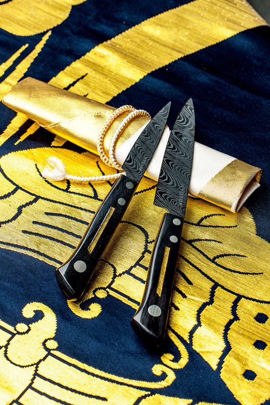 京セラと共同で制作した和柄のナイフ、西陣織のカバー/西陣織で作ったワインカバー