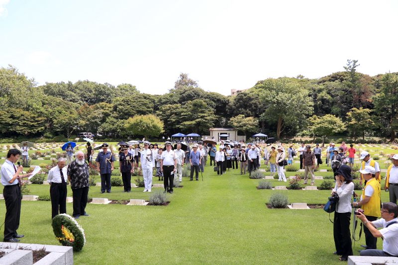 冒頭、初回から欠かさず参加している関田寛雄・日本基督教団牧師が追悼の辞で、5月のオバマ米大統領の広島訪問に触れながら、「共通の課題として核兵器廃絶と共生世界の現実のために共に働こうではありませんか」と語りかけた。続いて、カナダ大使館付武官のクリス・ディキンソン海軍大佐が英連邦代表として、「戦争を戦った元兵士たちが和解できるなら、私たちも個人として、また国として和解することができます」と挨拶。参加者は、粛々と続くスピーチに身じろぎもせずに耳を傾け、讃美歌を歌って献花した。