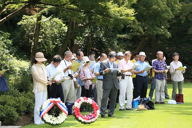 盛夏の陽光が緑の芝生を白く照らし、一帯を取り囲む木々の間で蝉しぐれが反響する。熱帯夜明けで早くから30度を超えていたが、参集した人たちは額から汗を噴き出しながらも、静かに頭を垂れていた。