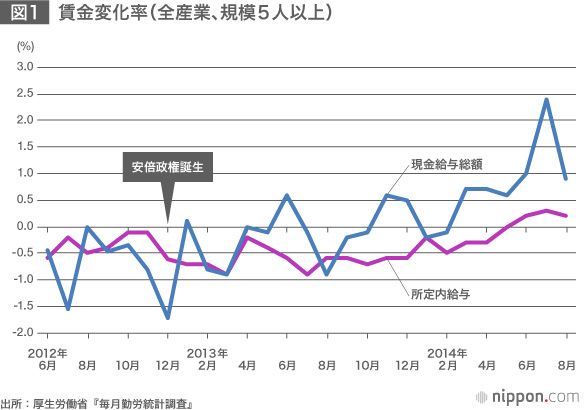 このため、アベノミクスでは、デフレ脱却に賃金の上昇が不可欠であると位置づけられ、経済界に賃上げを要請して、政治主導で賃金引き上げを進めようとの試みも行われた。しかし、第2次安倍政権誕生後、株価が急回復し、消費者物価も徐々に上昇するなかで、マクロ経済レベルで見た賃金の本格的な回復は、必ずしも順調なものではなかった。