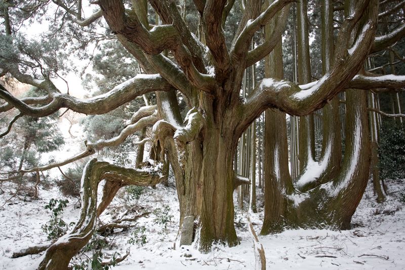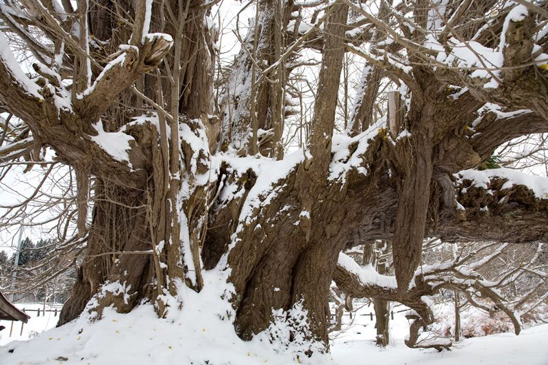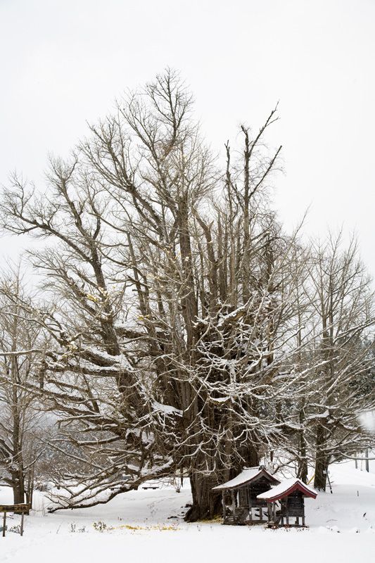 東北から北陸にかけての日本海側は、世界でもっとも積雪の多い地方の一つである。特に雪深い地に生息する巨樹は、集落の近くであっても、冬の間は雪に閉ざされて会いに行くこともままならない。それゆえにいっそう、雪の巨樹に出会う喜びは大きい。深い雪の中、一人じっと春の雪解けまで堪え忍ぶ姿は感動的ですらある。