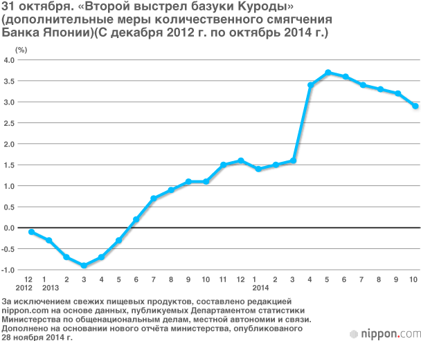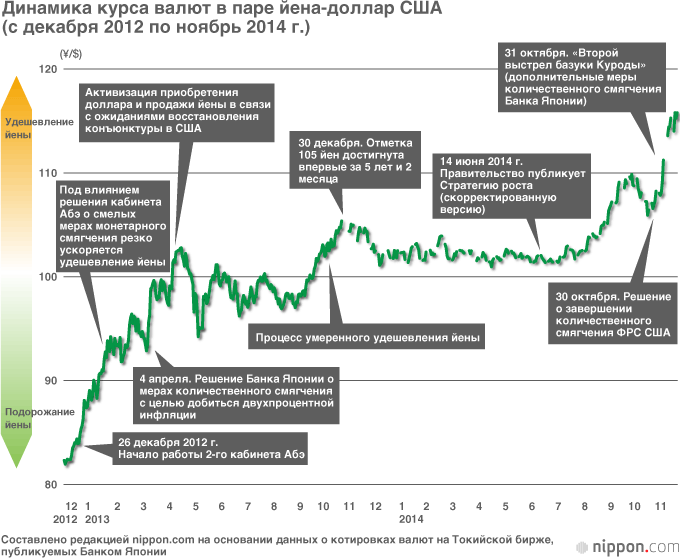 Как следует оценивать результаты двух лет «абэномики», которая станет одной из главных тем на всеобщих выборах в декабре? Смелые меры финансово-кредитной политики Банка Японии в определённой степени продемонстрировали свою результативность. Политика количественного смягчения с целью достижения двухпроцентной инфляции, принятая в апреле 2013 года, а также последовавшие в октябре нынешнего года дополнительные меры финансового смягчения привели к резкому удешевлению национальной валюты и росту фондового рынка. За означенный период ключевой индекс японского фондового рынка Nikkei 225, пусть и переживая отдельные спады, в целом впервые за семь последних лет вернулся к уровням порядка 17 000 пунктов. На валютном рынке котировки йены по отношению к доллару США в последнее время также демонстрируют удешевление японской валюты до уровней, близких к 116-117 йенам за доллар.