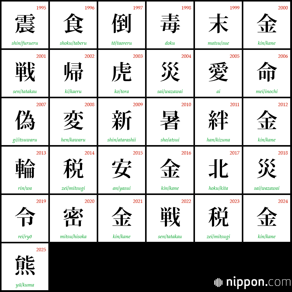 Below is our list of all the Kanji of the Year since the contest kicked off in 1995. Here’s hoping 2026 is a year that’s easier to bear than this one has been!