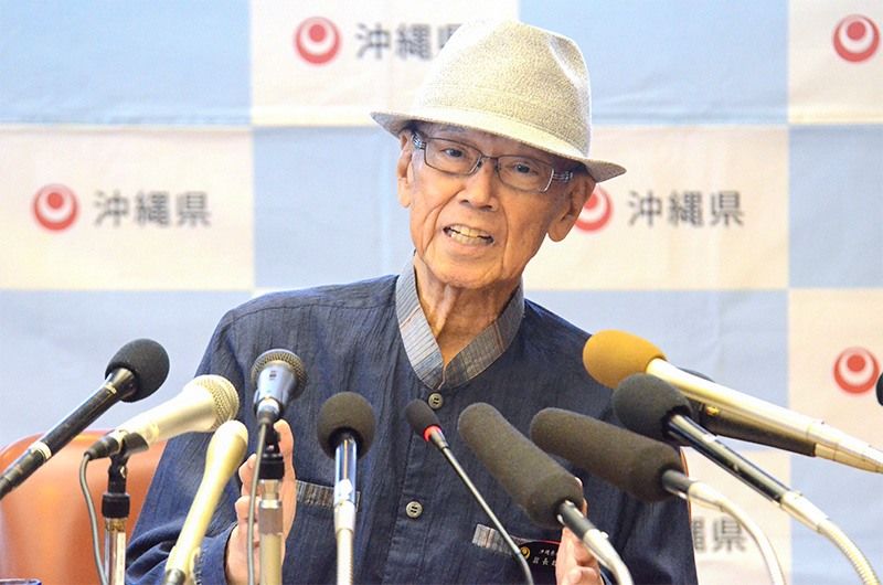 صورة ظهر فيها أوناغا وقد بدا عليه الضعف بشكل جلي في آخر مؤتمر صحفي له في 27 يوليو/تموز من عام 2018 لإلغاء إذن من المحافظة يسمح بنقل قاعدة فوتينما الجوية من غينووان إلى ناغو (حقوق الصورة لجيجي برس).