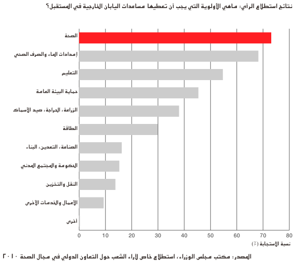 وقد أعرب نحو ٧٣٫١٪ من اليابانيين على الأقل في استطلاع للرأي العام جرى مؤخراً عن اعتقادهم بأنه على اليابان أن تولي القضايا الصحية أولويتها في مساعداتها الإنمائية الرسمية.