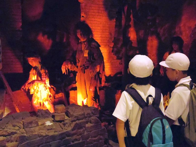 مجموعة من الأطفال يشاهدون مجسمات للناجين من القصف النووي بالمتحف التذكاري للسلام