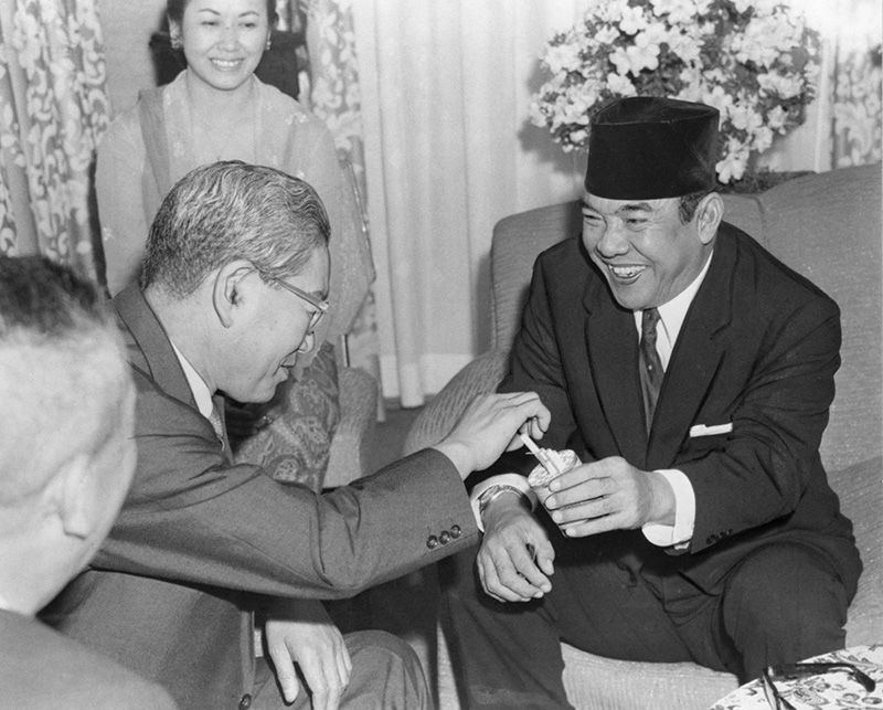 صورة تجمع بين رئيس الوزراء الياباني (آنذاك) ”إيكيدا هاياتو“ والرئيس الإندونيسي ”أحمد سوكارنو“ في يناير/كانون الثاني عام ١٩٦٤ وقبل انعقاد الأولمبياد (جيجي برس)
