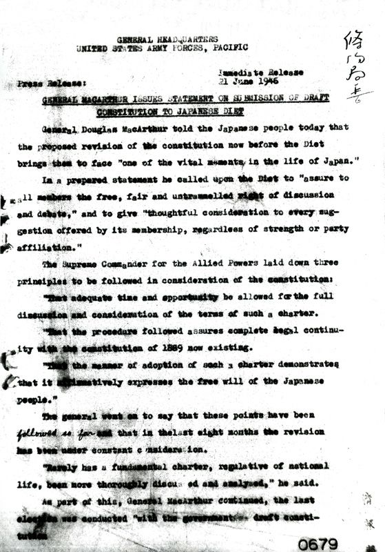 بيان الجنرال ماك آرثر بشأن مسودة الدستور، بتاريخ ٢١ يونيو/ حزيران عام ١٩٤٦