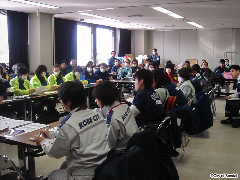 مقدموا الخدمات الصحية ومسؤولون آخرون من جميع أنحاء اليابان يجتمعون في حي مياغينو بمدينة سينداي لمناقشة سبل الحفاظ على صحة وسلامة الأفراد الذين تم إجلاؤهم عشية زلزال توهوكو المدمر في الحادي عشر من مارس/آذار 2011. الصورة التقطت في 22 مارس/ آذار 2011.
