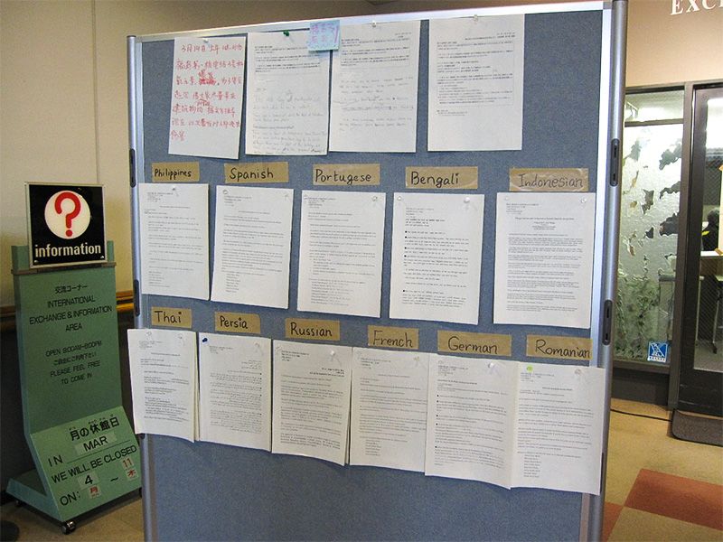 بمساعدة من جامعة طوكيو للدراسات الأجنبية، أعدت بلدية مدينة سينداي معلومات متعلقة بحالات الطوارئ بلغات متعددة في أعقاب كارثة الحادي عشر من مارس/ آذار. (الصورة مقدمة من مؤسسة سينداي الدولية للسياحة والمؤتمرات).