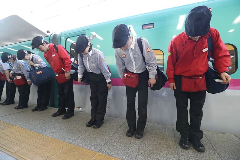 طاقم تنظيف قطار الشينكانسين يحنون رؤوسهم بعد توضيب أحد القطارات (حقوق الصورة لجيجي برس).