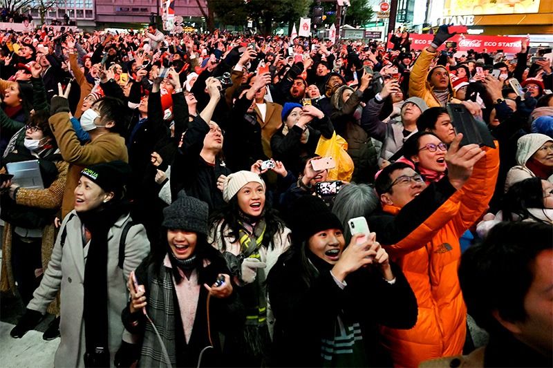تجمهر الحشود عند بداية العام الجديد في تقاطع الطرق المزدحم في شيبويا في 1 يناير/كانون الثاني من عام 2019 (حقوق الصورة لجيجي برس).