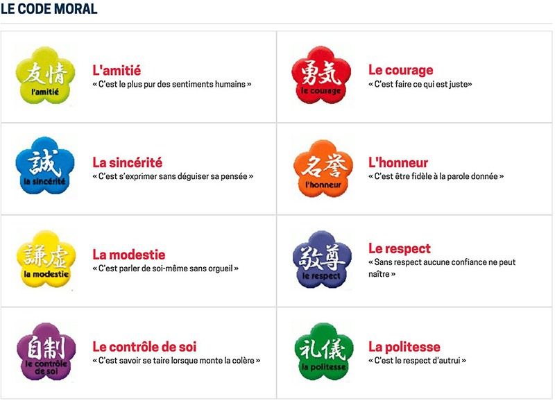 القانون الأخلاقي لفيدرالية الجودو الفرنسية حسب موقعها الإلكتروني الذي يضم الضوابط الثمانية المتمثلة في: الصداقة، الشجاعة، الصراحة، الاخلاص، التواضع، الاحترام، الانضباط النفسي، والأدب.