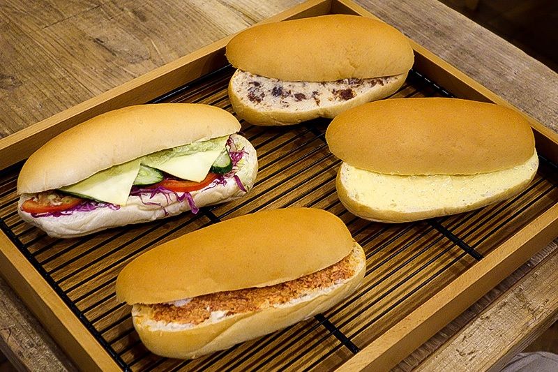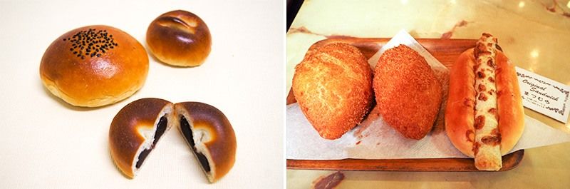 يسار= خبز أنبان من مخبز كيمورايا. هناك أنواع مختلفة من الطبقات العلوية والحشوة / يمين= ”تشيكوا دوغ (عجينة السمك المقلية)“ (أقصى اليمين) وغيره، مكونات خبز الوجبات الجانبية تعود في معظمها إلى أفكار يابانية خالصة.