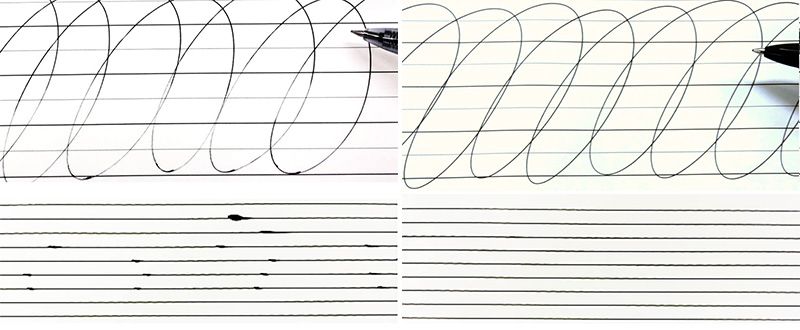 خطوط مرسومة بقلم تقليدي (يسار) وبقلم Uni-Ball Signo 307 (يمين)، (الصورتان من ميتسوبيشي بنسل).