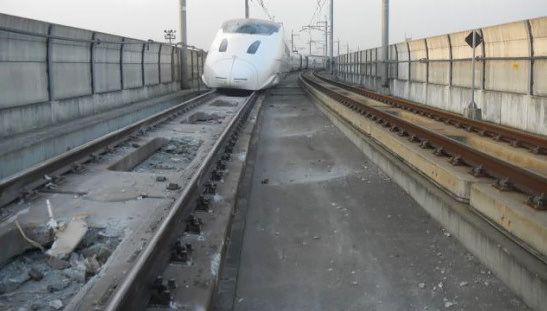 قطار خرج عن القضبان على خط كيوشو شينكانسن يجلس بلا حراك على المسارات في مدينة كوماموتو في ١٥ أبريل ٢٠١٦. (الصورة مقدمة من وكالة السياحة اليابانية من وزارة الأراضي والبنية التحتية والنقل، والسياحة، جيجي برس)