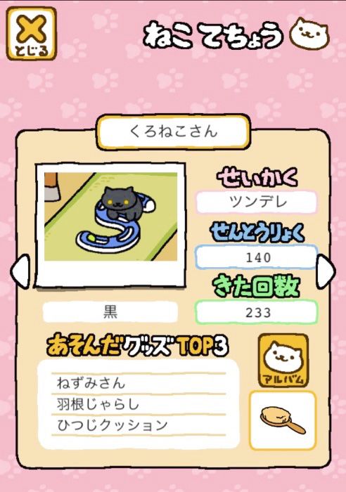 تقدم الملامح الشخصية لقطط معلومات عن كل زائر. القطة السوداء ”Kuroneko“ توصف هنا بأنها tsundere، بمعزل في البداية ولكنها حنون فيما بعد، تتباهى بـ ”مستوى مهارات قتالية“ يصل إلى ١٤٠، وزارت الحديقة ٢٣٣ مرة. في الجزء السفلي من لوحة التعريف بالشخصية توجد قائمة من المواد المفضلة لدى القطة السوداء ”Kuroneko“.
