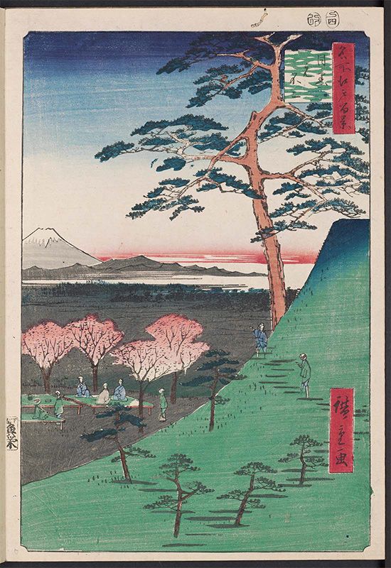 ميغورو موتو فوجي في سلسلة المطبوعات الخشبية طباعة ”١٠٠٠ منظر من إيدو“ للفنان أوتاغاوا هيروشيغيه. (مكتبة البرلمان الوطنية)